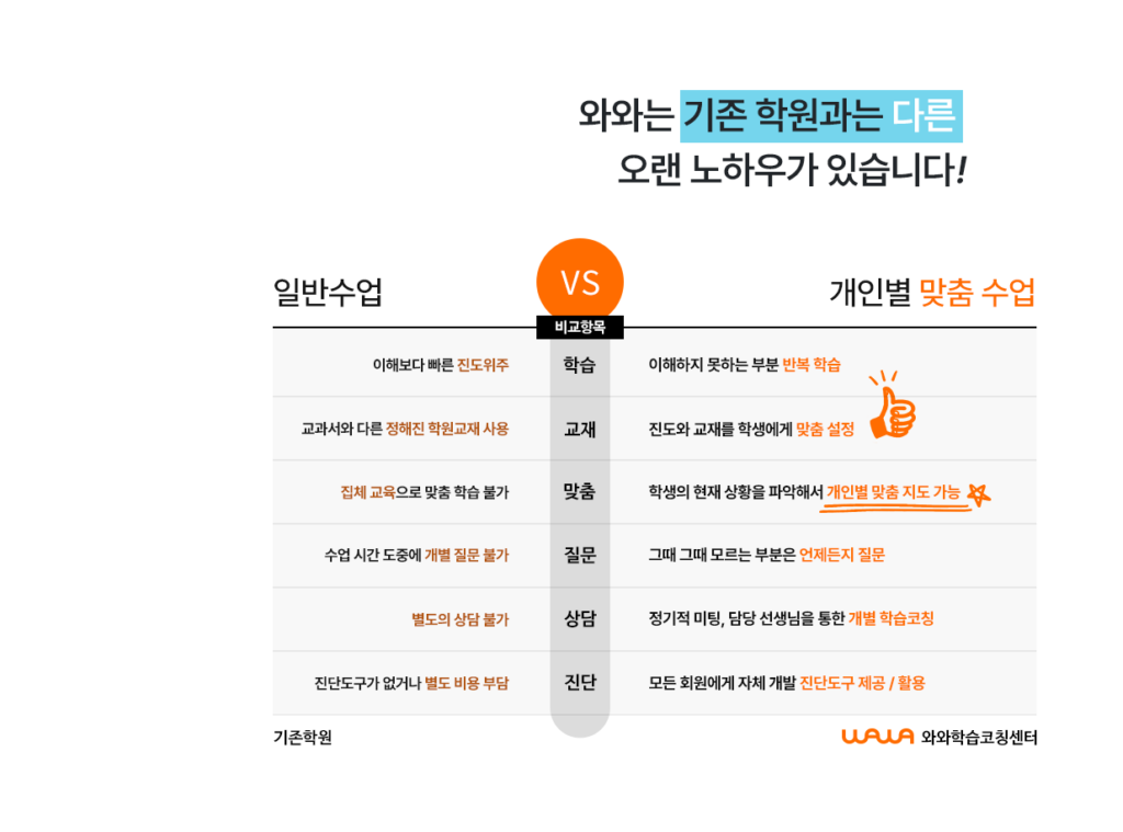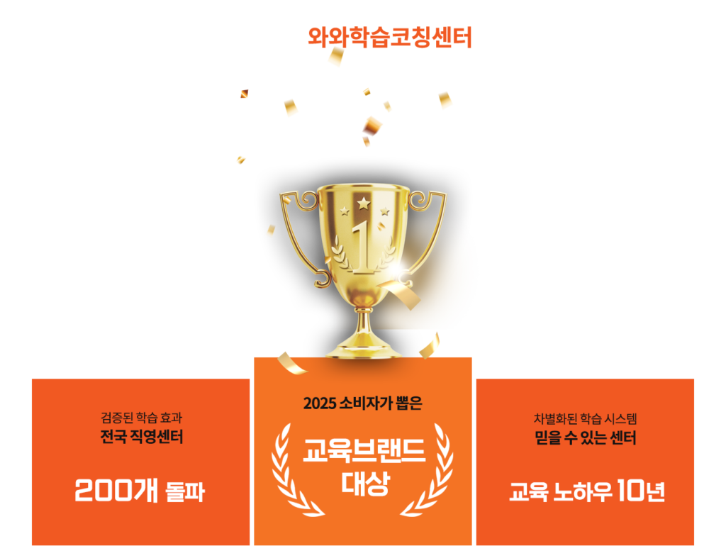 30년의 코칭 교육 노하우로 탄생한 와와학습코칭센터는 타 학원과는 차별화된 시스템으로 공부가 잘 되고, 성적이 오르는 성공 경험을 제공합니다.