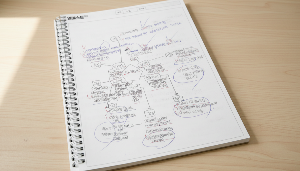 마인드맵·표·흐름 정리 등의 방식으로 개념을 정리한 뒤 백지에 기억나는 내용을 적으며 완전히 익힐 때까지 반복.